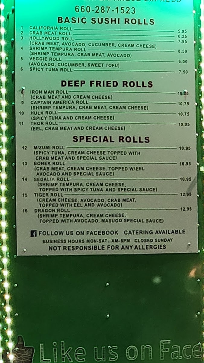 Embark on a culinary journey at Mizumi Sedalia, located at 1714 W Broadway Blvd, Sedalia, MO 65301, where every dish is crafted to delight your senses. Our menu showcases a range of delectable specialties designed to tantalize your taste buds. Among our highlights, the Bonek Roll and Thor Roll are must-tries, each offering a unique blend of flavors that promise an unforgettable dining experience. For those who prefer classic favorites, the Dragon Roll offers a delicious twist on a traditional favorite, while our Spring Roll provides a fresh and light option, perfect for any occasion. Join us and explore these top selections, artfully prepared with the freshest ingredients, at Mizumi Sedalia. We look forward to welcoming you to our table!